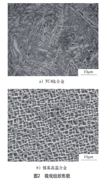 為了滿足在高溫高壓環(huán)境下的穩(wěn)定服役要求,航空發(fā)動(dòng)機(jī)葉片常用材料為鈦合金或高溫合金,近年來(lái),鈦鋁金屬間化合物也成為一種極有應(yīng)用潛力的葉片材料。鈦合金具有導(dǎo)熱性低、塑性低、彈性模量低以及親合力強(qiáng)等特點(diǎn),使其切削過(guò)程中出現(xiàn)切削力大、切削溫度高、加工硬化嚴(yán)重和刀具磨損大等問題,是典型的難加工材料(微觀組織形貌見圖2a)[7]。高溫合金的主要特點(diǎn)是塑性及強(qiáng)度高,導(dǎo)熱性差,并且內(nèi)部含有大量致密的固溶體[8]。在切削過(guò)程中塑性變形使得晶格嚴(yán)重扭曲,變形抗力大,導(dǎo)致切削力大并伴隨嚴(yán)重的冷硬現(xiàn)象,也是典型的難加工材料(微觀組織形貌見圖2b)。因此,研發(fā)鈦合金與高溫合金等難加工材料的高效精密切削技術(shù)至關(guān)重要。為了實(shí)現(xiàn)難加工材料的高效精密加工,國(guó)內(nèi)外學(xué)者從創(chuàng)新切削加工方法、優(yōu)選加工刀具材料以及優(yōu)化切削參數(shù)等方向進(jìn)行深入研究。