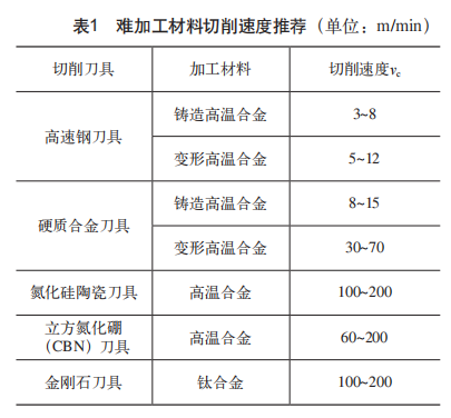 切削參數(shù)同樣是影響加工效果的重要因素,對(duì)應(yīng)材料使用合適的切削參數(shù)加工能夠有效提高加工質(zhì)量與效率。以切削速度參數(shù)為例,切削速度低容易在材料表面形成積屑瘤區(qū),降低表面加工精度;切削速度高容易發(fā)生熱量積聚,引起工件和刀具的燒傷。對(duì)此,哈爾濱理工大學(xué)翟元盛教授團(tuán)隊(duì)分析常用難加工材料的機(jī)械物理性質(zhì),通過(guò)正交加工試驗(yàn)總結(jié)出難加工材料切削速度推薦表[14](見表1),使用表中推薦的刀具和切削速度進(jìn)行加工能夠有效減小加工缺陷與刀具磨損,提高加工質(zhì)量。