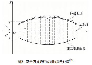 基于上述的預(yù)測(cè)模型或在機(jī)測(cè)量技術(shù),人們能夠?qū)庸?shù)進(jìn)行優(yōu)化甚至是實(shí)時(shí)調(diào)控。主流的方向是通過(guò)刀具路徑的重新規(guī)劃來(lái)對(duì)變形和振動(dòng)造成的誤差進(jìn)行補(bǔ)償。這一方向常用的方法是“鏡像補(bǔ)償法”[20](見圖5),該方法通過(guò)對(duì)名義刀具軌跡進(jìn)行修正,補(bǔ)償單次切削的變形量。但是單次補(bǔ)償會(huì)產(chǎn)生新的加工變形,因此需要通過(guò)多次補(bǔ)償在切削力和加工變形之間建立迭代關(guān)系,逐次修正變形量。除了基于刀具路徑規(guī)劃進(jìn)行主動(dòng)誤差補(bǔ)償?shù)姆椒ㄖ?,許多學(xué)者也在研究通過(guò)優(yōu)化調(diào)控切削參數(shù)、刀具參數(shù)等方式來(lái)控制變形和振動(dòng)。對(duì)于某型號(hào)航空發(fā)動(dòng)機(jī)葉片的切削加工,改變加工參數(shù)進(jìn)行多輪正交試驗(yàn),基于試驗(yàn)數(shù)據(jù)分析各切削參數(shù)、刀具參數(shù)對(duì)葉片加工變形、振動(dòng)響應(yīng)的影響規(guī)律[21-23],建立經(jīng)驗(yàn)預(yù)測(cè)模型,從而優(yōu)選加工參數(shù),有效減小
