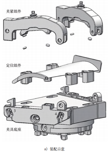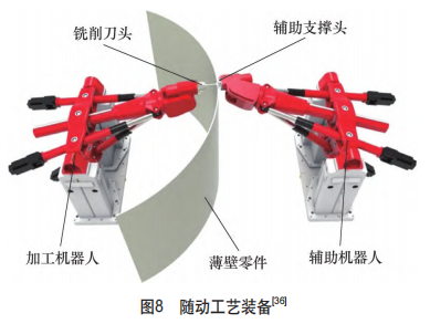 目前在工藝裝備設(shè)計(jì)過(guò)程中,普遍使用有限元分析、遺傳算法等手段來(lái)優(yōu)化多點(diǎn)輔助支撐的布局[35],但是優(yōu)化的結(jié)果通常只能保證在一點(diǎn)上的加工變形量達(dá)到最小,而并不能保證在其他加工部位也能起到同等的抑制變形效果。在葉片加工過(guò)程中,通常在同一機(jī)床上對(duì)工件進(jìn)行一系列的走刀加工,但加工不同部位的裝夾需求是不同的,甚至可能是時(shí)變的。對(duì)于靜態(tài)多點(diǎn)支撐方法,如果通過(guò)增加輔助支撐的數(shù)量來(lái)提高工藝系統(tǒng)剛度,一方面會(huì)增大工裝的質(zhì)量和體積,另一方面也壓縮了刀具的運(yùn)動(dòng)空間。而如果在加工不同部位時(shí)重新設(shè)置輔助支撐的位置,則必然會(huì)中斷加工過(guò)程,降低加工效率。因此,根據(jù)加工過(guò)程自動(dòng)在線調(diào)節(jié)支撐布局和支撐力的隨動(dòng)工藝裝備[36-38]被提出。隨動(dòng)工藝裝備(見圖8)能夠在任一加工工序開始前,基于時(shí)變切削過(guò)程的刀具軌跡與工況轉(zhuǎn)變,通過(guò)刀具與工裝的協(xié)同配合實(shí)現(xiàn)動(dòng)態(tài)支撐:先將輔助支撐移動(dòng)到有助于抑制當(dāng)前加工變形的位置,使工件的加工區(qū)域受到積極支撐,而工件其他部位在盡可能少的接觸下保持定位不變,從而匹配加工過(guò)程中時(shí)變的裝夾需求。
