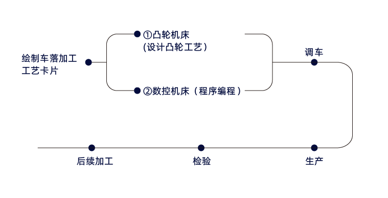 車落零件加工工序第一步需要繪制車落工藝卡片,然后通過車落工藝圖進行凸輪加工工藝(凸輪機床)的設計,并將設計好的凸輪加工工藝通過專用的凸輪加工設備加工制造出來,后續(xù)調(diào)整工通過加工制造出來的凸輪來進行設備的調(diào)整;數(shù)控機床則需通過機床G代碼M指令進行編程,通過編程好的程序進行調(diào)車實現(xiàn)復雜零件的生產(chǎn)制造。