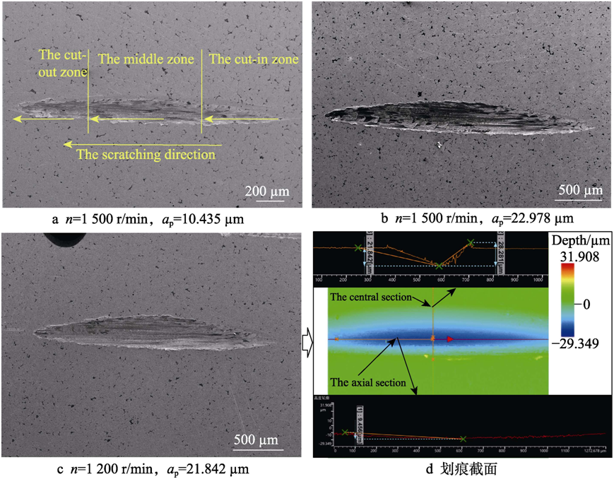 現(xiàn)象與仿真吻合,并在劃痕邊緣和尾部均出現(xiàn)了“飛邊”現(xiàn)象。