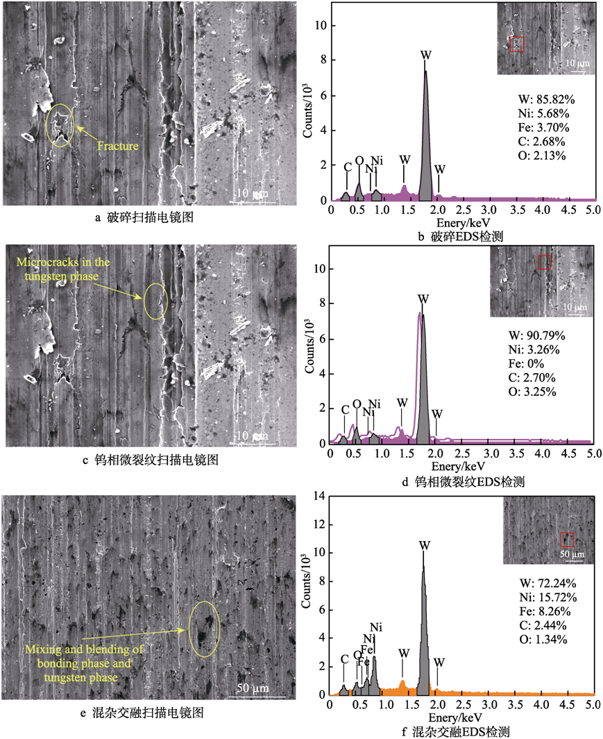4)磨削后鎢合金表面出現(xiàn)了單顆??虅潉澓凵系乃腥コ卣?,與單顆粒劃痕去除特征吻合。不同的是,磨削后的劃痕底部出現(xiàn)了區(qū)域性和放射狀裂紋,并通過截面顯微法和 EDS 檢測技術(shù)探究了裂紋的成因及擴展情況。