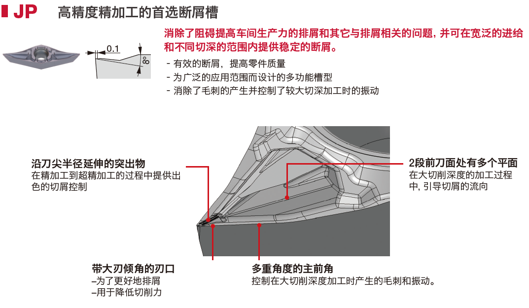 作為精密加工的首選斷屑槽,JP斷屑槽在廣泛的應(yīng)用范圍內(nèi)提供安全的切屑控制。該斷屑槽還有助于在廣泛的切削深度和進(jìn)給速度組合中有效地消除毛刺形成和振刀痕跡。