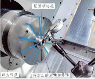 若在零件粗加工階段,使用退火處理后的棒料,將外徑和端面光整后裝夾外徑,一次裝夾進行內(nèi)徑打孔和擴孔,再進行小外徑的切削,通過熱處理應力釋放后,再進行后續(xù)零件半精加工和精加工,可以保證應力釋放條件下零件的加工精度;若采用磁力吸盤和定位銷釘配合裝夾的方式,能夠實現(xiàn)軸向壓緊的無徑向力裝夾方式,可以大大減小加工過程中由于裝夾力產(chǎn)生的法蘭盤徑向形變,提高機械加工的尺寸精度和幾何精度,保證零件加工的最終效果。