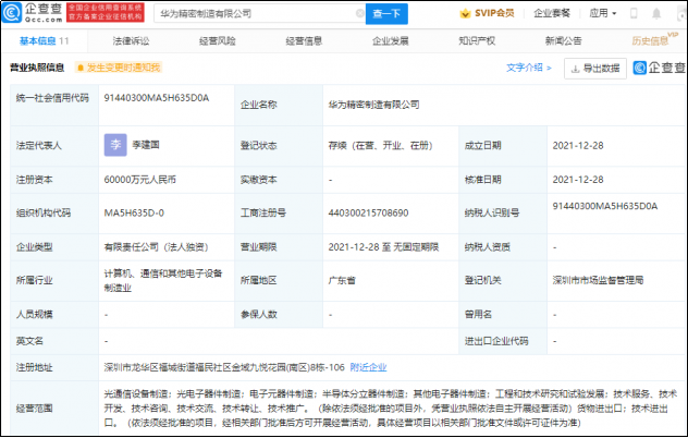 華為成立精密制造有限公司,注冊(cè)資本6億元人民幣,經(jīng)營(yíng)范圍包含:光通信設(shè)備制造;光電子器件制造;電子元器件制造;半導(dǎo)體分立器件制造;其他電子器件制造;工程和技術(shù)研究和試驗(yàn)發(fā)展;技術(shù)服務(wù)、技術(shù)開(kāi)發(fā)、技術(shù)咨詢(xún)、技術(shù)交流、技術(shù)轉(zhuǎn)讓、技術(shù)推廣。