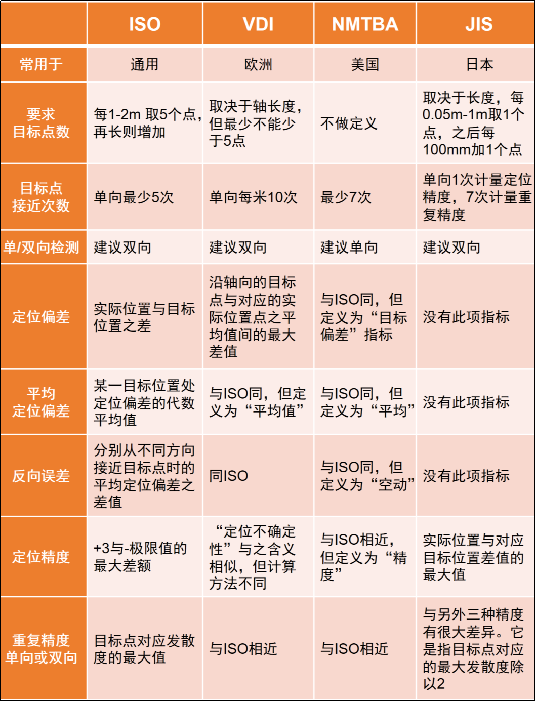 這是4種標(biāo)準(zhǔn)的關(guān)鍵區(qū)別點描述,正如人們所期待的,總有一天,所有機(jī)床生產(chǎn)商都統(tǒng)一遵循ISO標(biāo)準(zhǔn)。因此,這里選擇ISO標(biāo)準(zhǔn)作為基準(zhǔn)。下表中對4種標(biāo)準(zhǔn)進(jìn)行了比較,本文僅涉及線性精度,因為旋轉(zhuǎn)精度的計算原理與之基本一致。